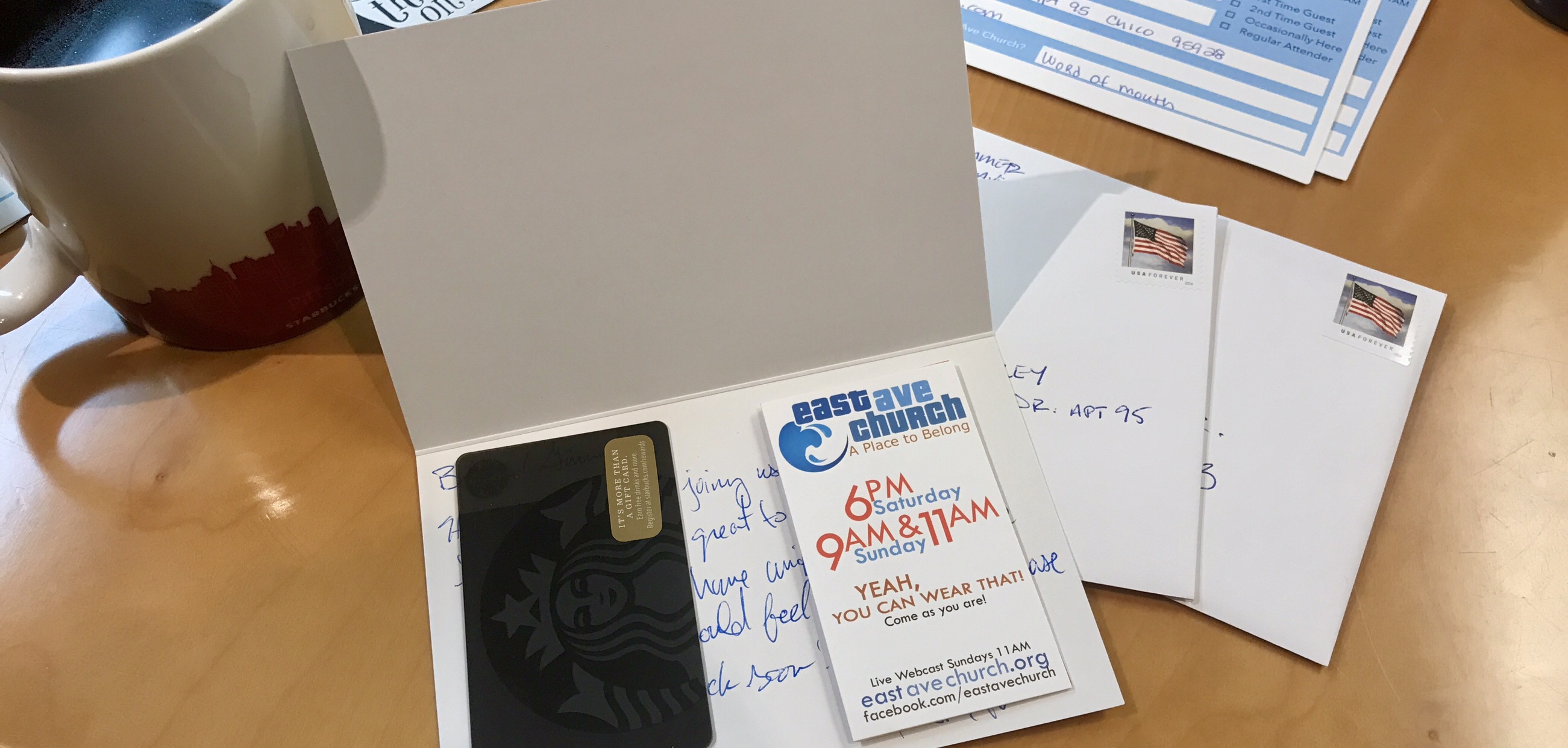 For our church, every first and second time guests get a handwritten thank you card from the person who brought the message that weekend. Yes, handwritten. WE do not send form letters or post cards — we actually sit down with a pen and write! We include in the card a $5 Starbucks gift card (sans the sleeve) and an Invite Card with the service times on it.